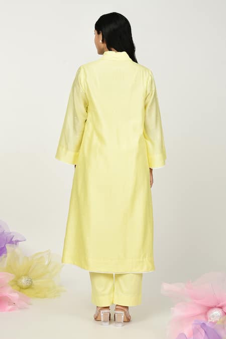 Yellow Chanderi, Cotton Lace Shawl Neck Embroidered Jacket Kurta And Pant Set