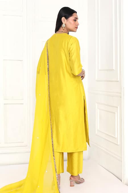 Mustard chanderi tunic featuring floral sequin and bead embellished yoke panel. Paired with straight pant and embroidered organza dupatta with kiran lace border.