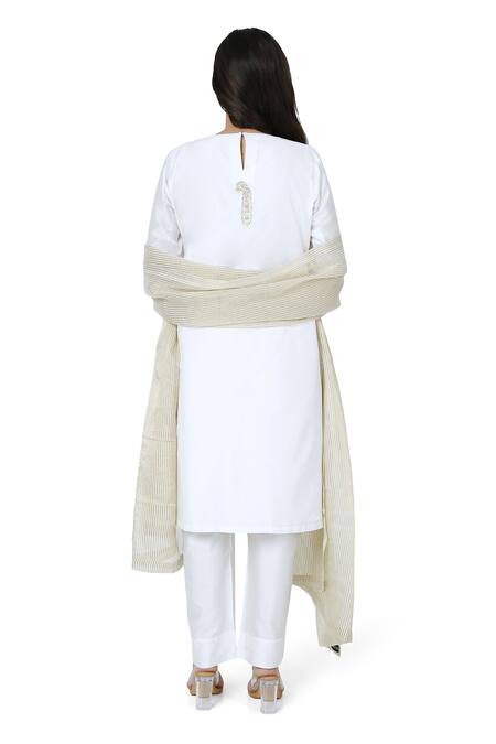 White kurta featuring sequin embroidered paisley motifs with a round neckline. Paired with matching pants and a striped organza dupatta.