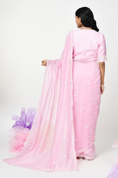 Pink chanderi saree featuring thread and aari placement embroidery in floral pattern. Paired with a half sleeve padded blouse with a boat neckline.