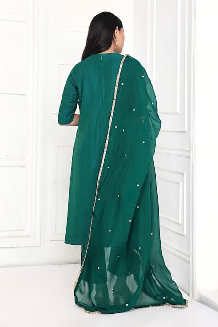 Rama green tunic featuring floral sequin and bead embellished yoke panel with front inverted box pleat detail. Paired with straight pant and embroidered organza dupatta with kiran lace border.