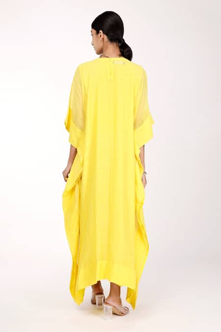 Yellow chanderi kaftan with badla and mukaish embroidery. Comes with a butter crepe inner.