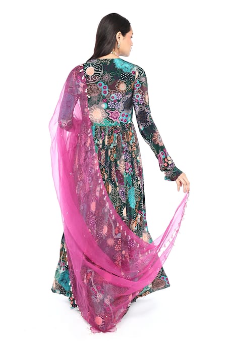 Multi colored anarkali featuring floral print with sequin and bead embroidery on the yoke. Paired with an organza dupatta adorned with bead details along the edges.