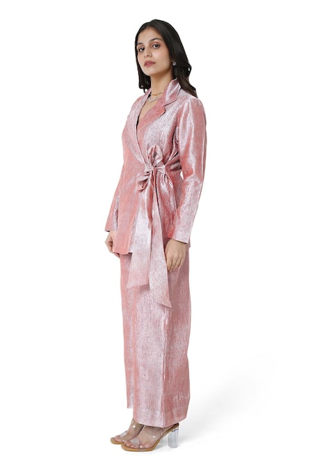 Red Crushed Tissue Notched Lapel Front Tie-up Jacket And Pant Set