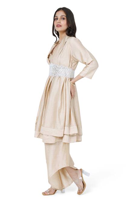 Beige layered kurta featuring a collared neck and three quarter sleeves. Paired with an asymmetric pant and a quilted belt.