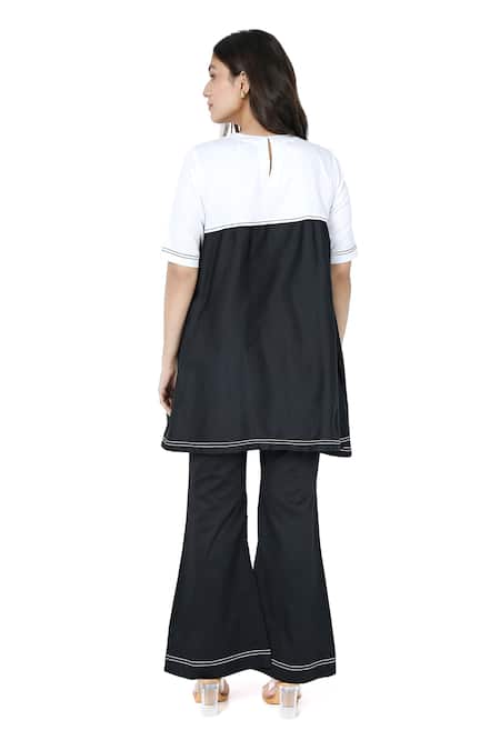Black and white tunic featuring half sleeves, round neckline, and patchwork design with stitch lines detailing. Paired with matching bootcut pants for a complete look.