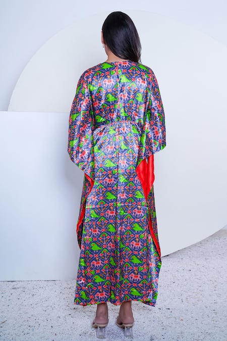 Grey kaftan with all-over Patola print, hand embroidery at the neckline and waist.