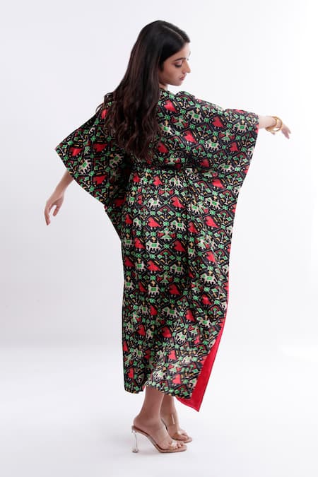 Black kaftan in mashru base fabric with patola print & leaf motif embroidery.