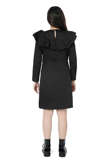 Black solid dress featuring full sleeves and a ruffled yoke detailing