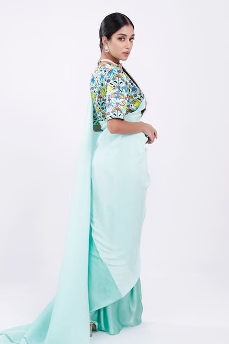 Mint green saree with half pleated fabric & half satin base. Paired with patola print blouse.