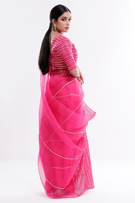 Pink Organza Striped V Neck Rani Chand Saree With Blouse