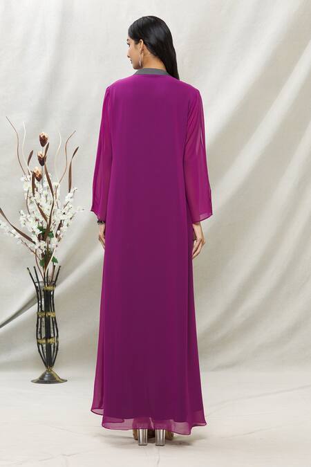 Purple tunic with embellishment on the placket and grey band collar.