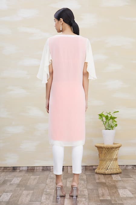 Cream and orange layered long tunic with asymmetrical hem and flared sleeves, embellished with stones on the neckline.