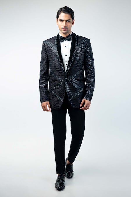Black velvet tuxedo jacket featuring sequin, cutdana and resham embroidery. Paired with a white pleated shirt, black trouser and bow tie.