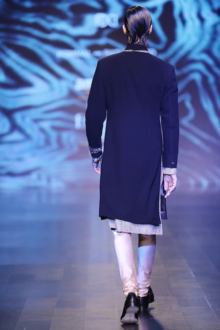 Navy blue solid blended cupro ajkan jacket with a front placket.