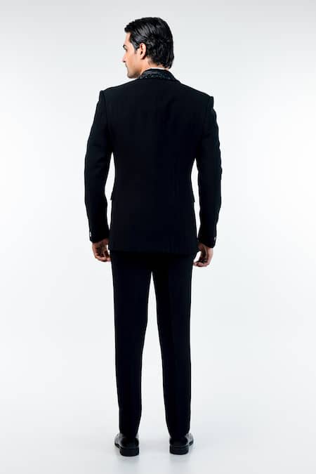Black Cupro Embroidered Cutdana Tuxedo Waistcoat Set