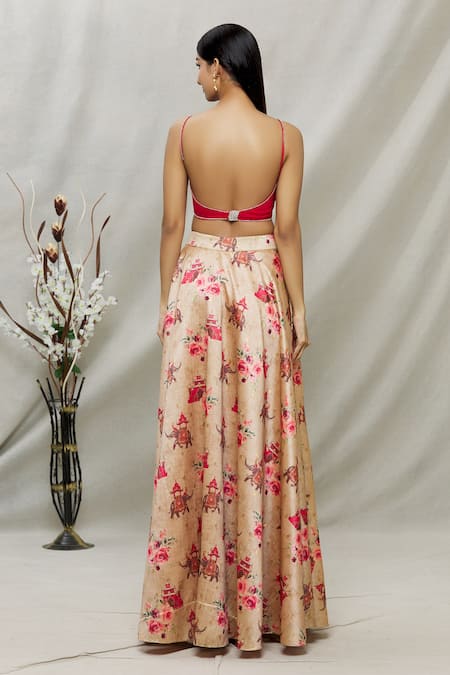 Beige lehenga with all-over elephant and floral print. Comes with strappy red blouse and dupatta.