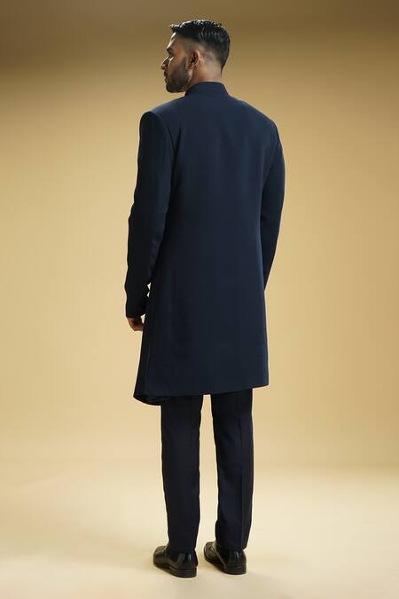 Navy blue cupro achkan featuring a full sleeve design and mandarin collar with sequins embroidery on the chest patch. Paired with matching dark navy trousers.
