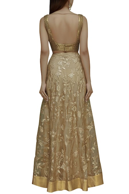 Beige lehenga with all over floral aari work. Comes with matching blouse piece and zari scallop border dupatta.