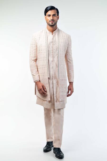 Rose pink front open sherwani featuring all over floral jharokha hand embroidery. Paired with a coordinating rose pink and off white front open kurta and trouser, both adorned with floral hand embroidery.
