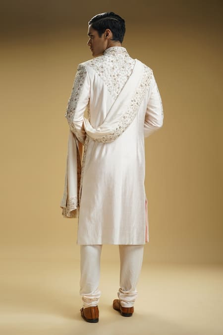 Light pink sherwani featuring floral motifs embroidery with a mandarin collar. Paired with a churidar, kurta, and a stole.
