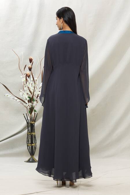 Grey Georgette Embellished Stone Band Layered Collar Tunic