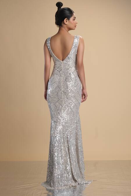 Silver Lycra Stretch Net Embroidered Sequins V Neck Sleeveless Gown