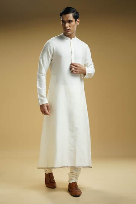 Off white cotton silk kurta featuring a mandarin collar and full sleeves. Paired with a churidar and includes a front buttoned placket and side pockets.