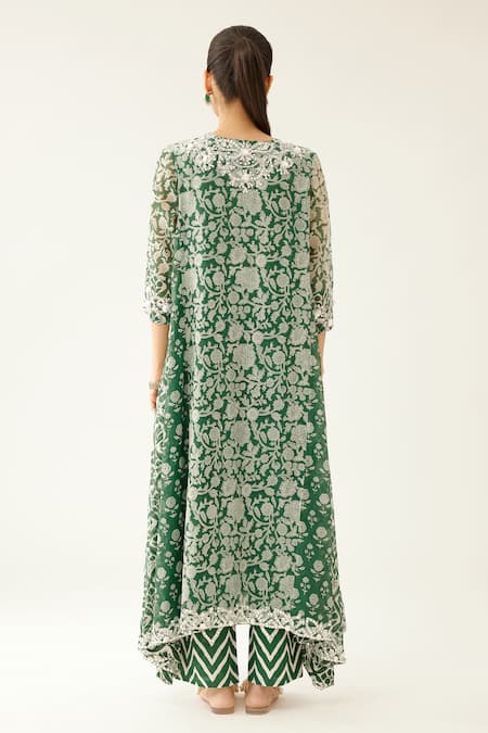 Green asymmetric kalidar kurta featuring floral and mughal hand block print with sequin, tassel, and bead work on the neckline and sleeve hem. Paired with a cotton slip, chevron hand block printed straight pant, and a silk chanderi dupatta with thread tassel border.