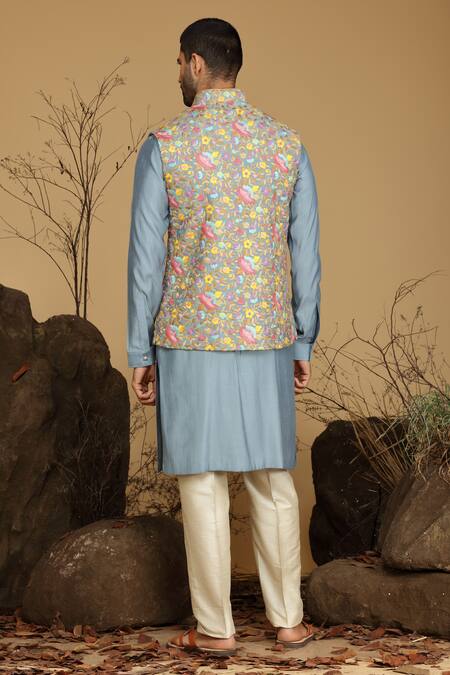 Grey bundi featuring floral thread embroidery with a mandarin collar. Paired with a full sleeve kurta and aligadhi pant.