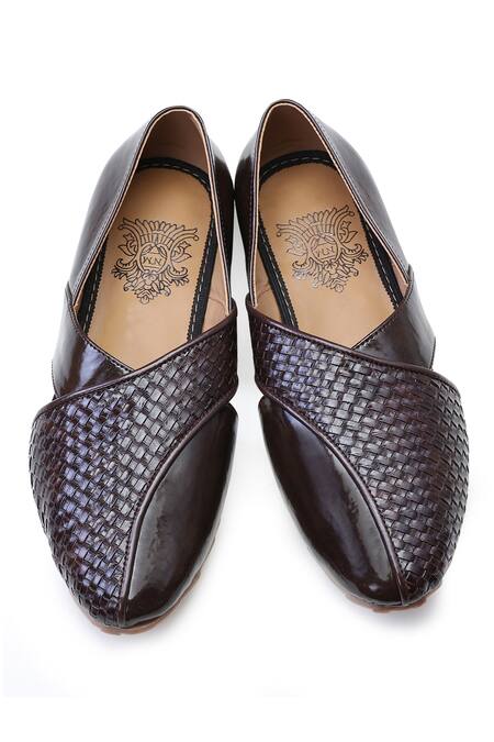 Brown handcrafted sandals with weave pattern, side cutouts & almond toe.