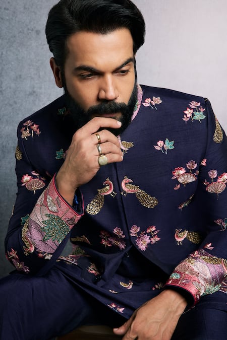 Navy blue bandhgala featuring full sleeves and mughal motif embroidery. Paired with matching pants for a complete look.