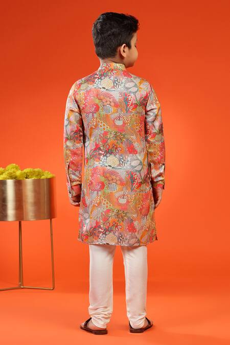 Pink kurta featuring all over retro floral print in silk material. Paired with a cream churidar for a complete look.