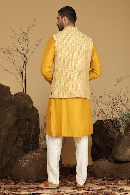 Yellow silk bundi featuring thread embroidery in floral pattern and mandarin collar. Paired with a full sleeve kurta and pant.