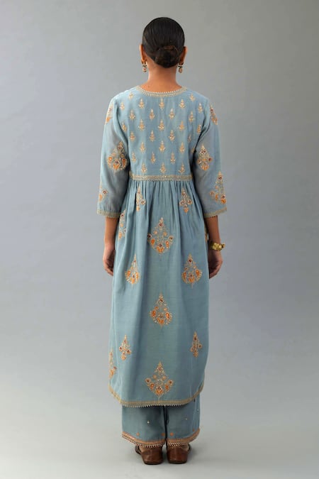 Light blue silk chanderi anarkali featuring floral vintage motifs with multi-color silk thread, dori, zari & sequin embroidery. Paired with embroidered pants and a chevron bordered dupatta with tasselled edges.