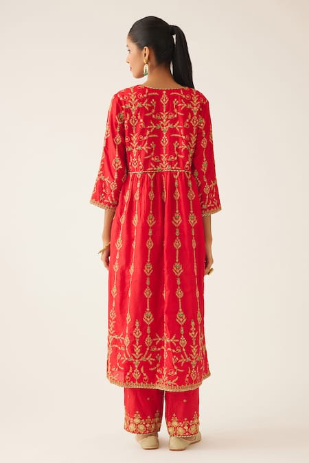 Red , Organza Embroidery, Sequins V-neck Dori Kurta Pant Set