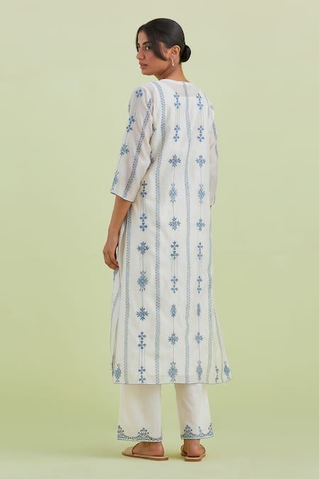 Off white kurta featuring blue handblock print with mirror and thread embroidery. Paired with a matching pant with printed hem and a tasseled dupatta.