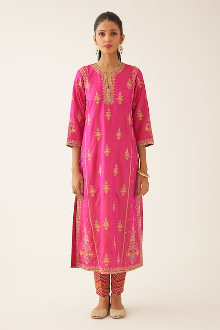Pink silk straight kurta featuring dori, thread, beads & sequins embroidery. Accompanied by a red salwar and a multi-colored silk organza dupatta.