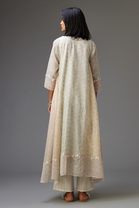 Multicolor kurta featuring floral hand block print, notched neckline, and ric rac lace hem. Paired with cotton slip, stripe print pant, and a dupatta with tassel borders.