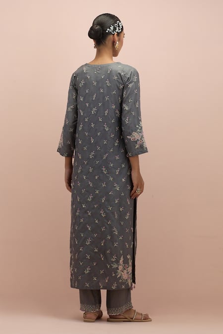 Grey kurta featuring notched neck, three-quarter sleeves, and scattered floral embroidery with sequins and beads. Paired with matching pants and a silk organza dupatta adorned with placement embroidery.