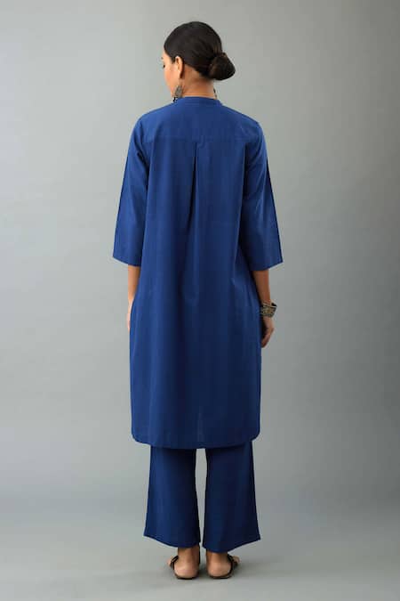 Blue handloom cotton kurta featuring a mandarin collar and front button placket. Paired with straight pants and a silk scarf with multi bead and tassel details.