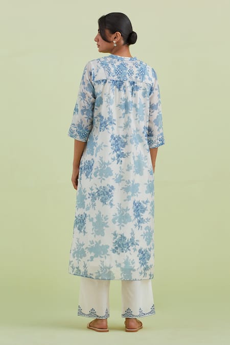 Blue floral embroidered kurta featuring a round neckline and three-quarter sleeves. Paired with off white pants and a matching dupatta with printed details.