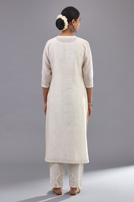 Off-white silk chanderi straight kurta featuring dori and silk thread embroidered neckline, armholes, hem, and sleeve cuffs. Paired with cotton pant, a slip, and a cotton chanderi dupatta with butti work and scalloped edges.