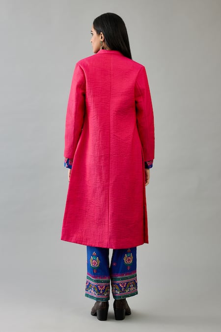 Pink silk long jacket featuring quilted texture. Paired with a cutwork embroidered shirt and matching pant with intricate thread and mirror work.