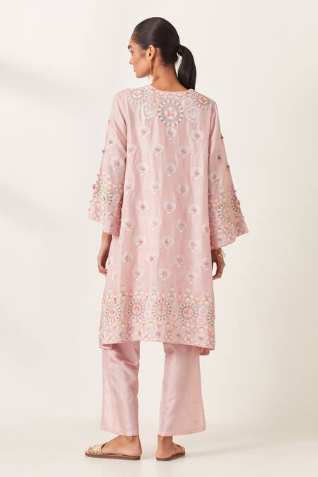 Pink silk kurta featuring a notched neckline with aari embroidered floral motifs, highlighted by applique work and tassels. Paired with matching silk pant and a silk organza dupatta with ric-rac lace border.