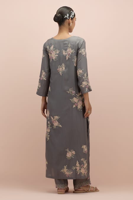 Grey silk kurta featuring scattered floral embroidery with sequins and beads. Paired with a matching pant and a contrasting silk organza dupatta adorned with placement embroidery.