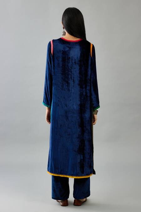 Blue , Satin, Velvet Tassels Split V-neck Embroidered Kurta Set