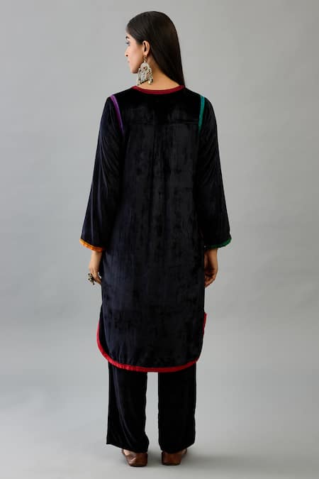 Black silk velvet kurta featuring multicolor thread embroidered contrast border. Paired with straight pant and a grey hand crushed silk stole with floral applique work and tassel embroidered edges.
