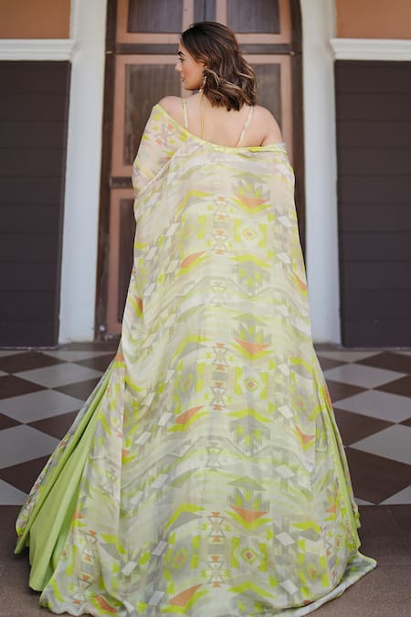 Lime green lehenga set featuring a geometric print cape and an attached cancan lehenga. The padded blouse is adorned with zari, beads, and gota embroidery.