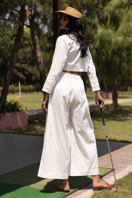 White solid base crop top with placed pleated panels. Comes with matching pant.